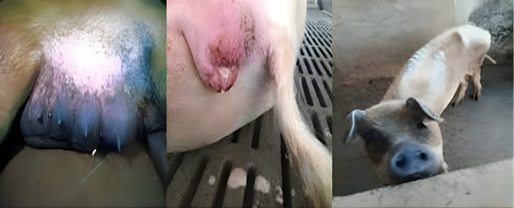 - Vú sưng – cứng – đau, heo phản ứng mạnh khi chạm vào