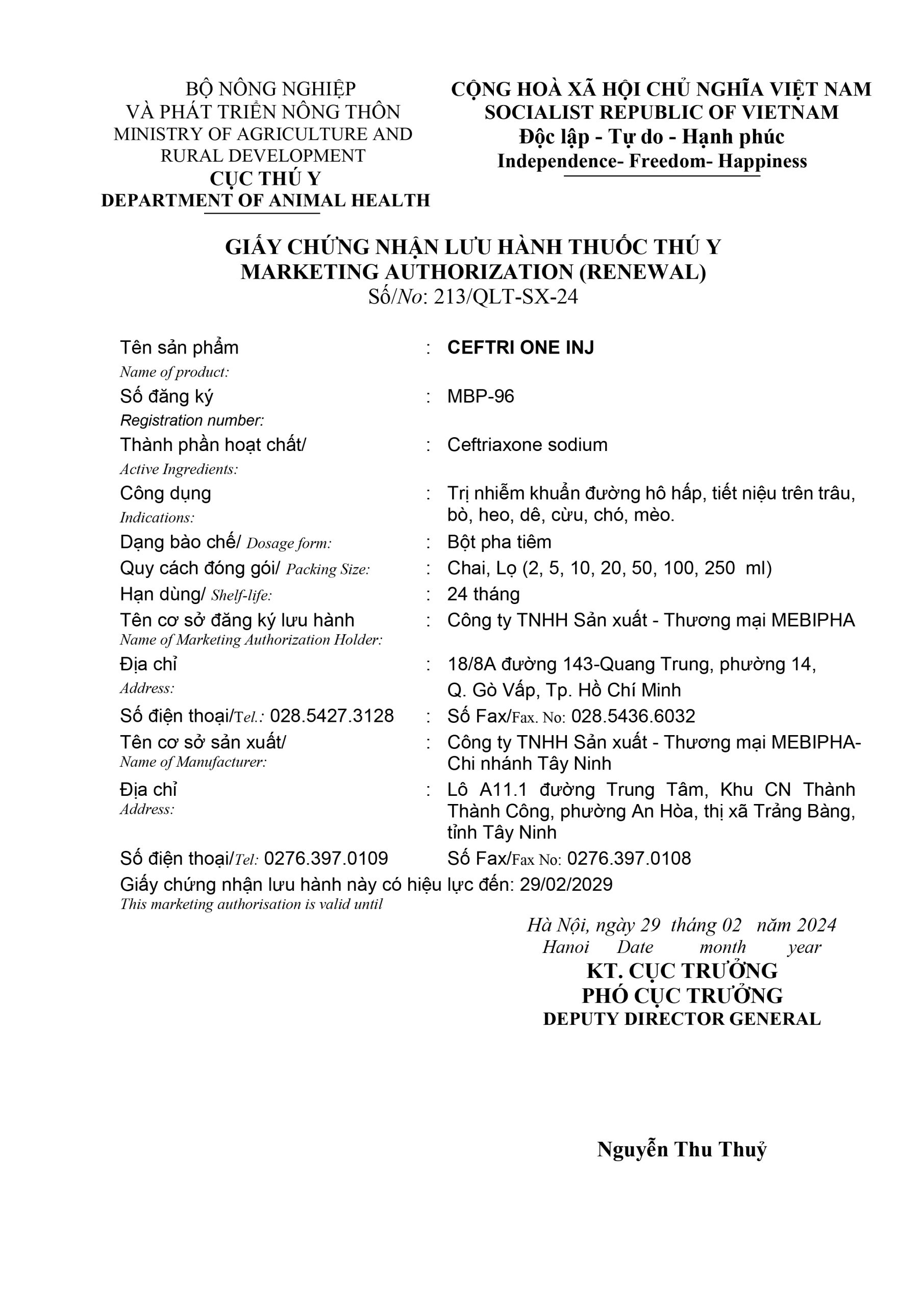 Ceftriaxone là kháng sinh thuộc nhóm Cephalosporin thế hệ III, CEFTRI ONE INJ ức chế sự tổng hợp thành tế bào của vi khuẩn, bằng cách ấy gây đặc tính diệt vi khuẩn. Ceftriaxone kháng các vi khuẩn G-, G+ gây bệnh đường ruột và đường hô hấp ở heo như: E.coli, Salmonella, Pasteurella, Pneumococcus, Streptococci, Staphylococci, Haemophilus, Actinobacillus, Enterobacter, Proteus, Klebsiella spp, Leptospira, Pseudomonas, Erysipelothrix.
